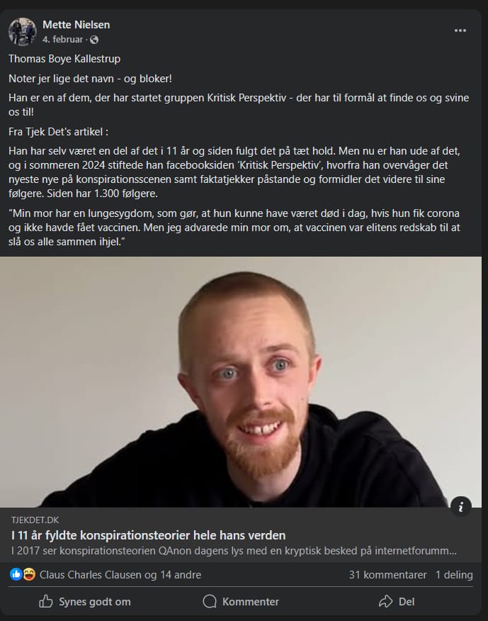 Men når jeg siger noget? Så skal jeg slettes. Blokeres. Svines til. Jeg skal reduceres til den mindst troværdige i verden – på baggrund af et par Facebook-opslag og et smilende foto. Tilsyneladende ser sådan en “deep state fupmager” ud.